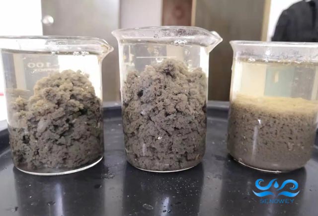 聚丙烯酰胺PAM為陽離子型高分子聚合物,吸附在顆粒表面上的高分子長鏈可能同時吸附在另一個或多個顆粒表面,通過架橋方式將2個或更多的微粒連在一起,從而導致微粒絮凝,改善污泥脫水性能。此外,陽離子型聚丙烯酰胺PAM在吸附架橋作用的同時,還可對帶負電荷的污泥膠體顆粒產生電中和作用,獲得更好的絮凝效果。但當其投加過量時,溶液中高濃度的高分子也能使顆粒表面完全被所吸附的高分子覆蓋,架橋作用大大減弱,而且過量的陽離子會使污泥顆粒帶上正電荷,重新相互排斥,絮凝效果快速下降,污泥脫水性能變差。